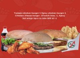 1 tomato chicken burger, 1 spicy chicken burger, 1 chicken cheese burger, 1 french fries, 2 corndog, 500ml coke